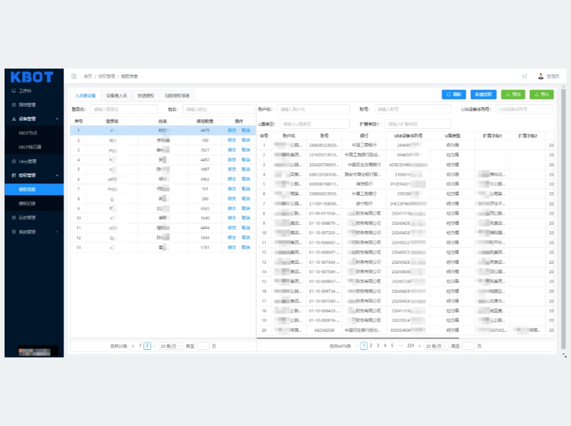 10、U盾信息入库:支持UKey信息管理,信息包含但不限于户名、银行账号、开户行、UKey类型、到期时间、UKey密码、账号、账号密码等。其中密码信息进行AES256高强度对称加密,落盘密文存储。支持不同类型UKey管理,例如网银U盾、CA证书、加密狗、招投标Key、社保Key等,并维护对应类型的业务信息不同。